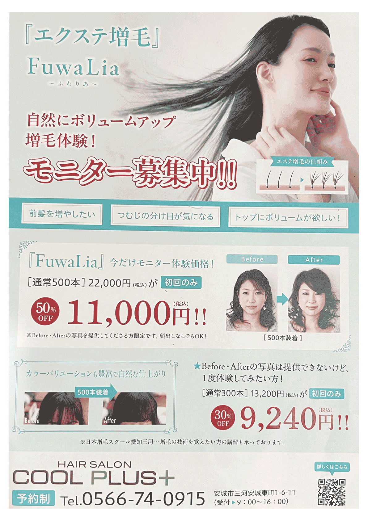 エクステ増毛「FuwaLia」を始めました。髪のボリュームが気になるお客様に大変ご好評いただいております。